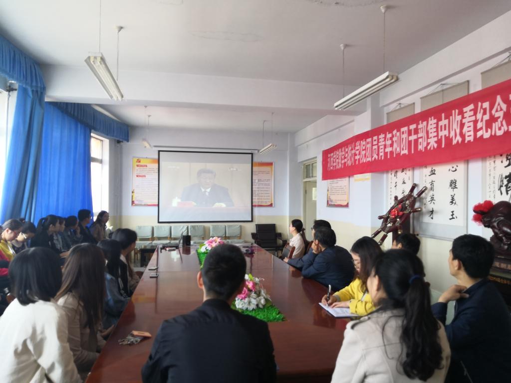 4月30日上午10:30公司领导、教师代表、员工党员、共青团干部等共计40余人在三号教学楼六楼会议室观看了纪念五四运动100周年大会实况直播。