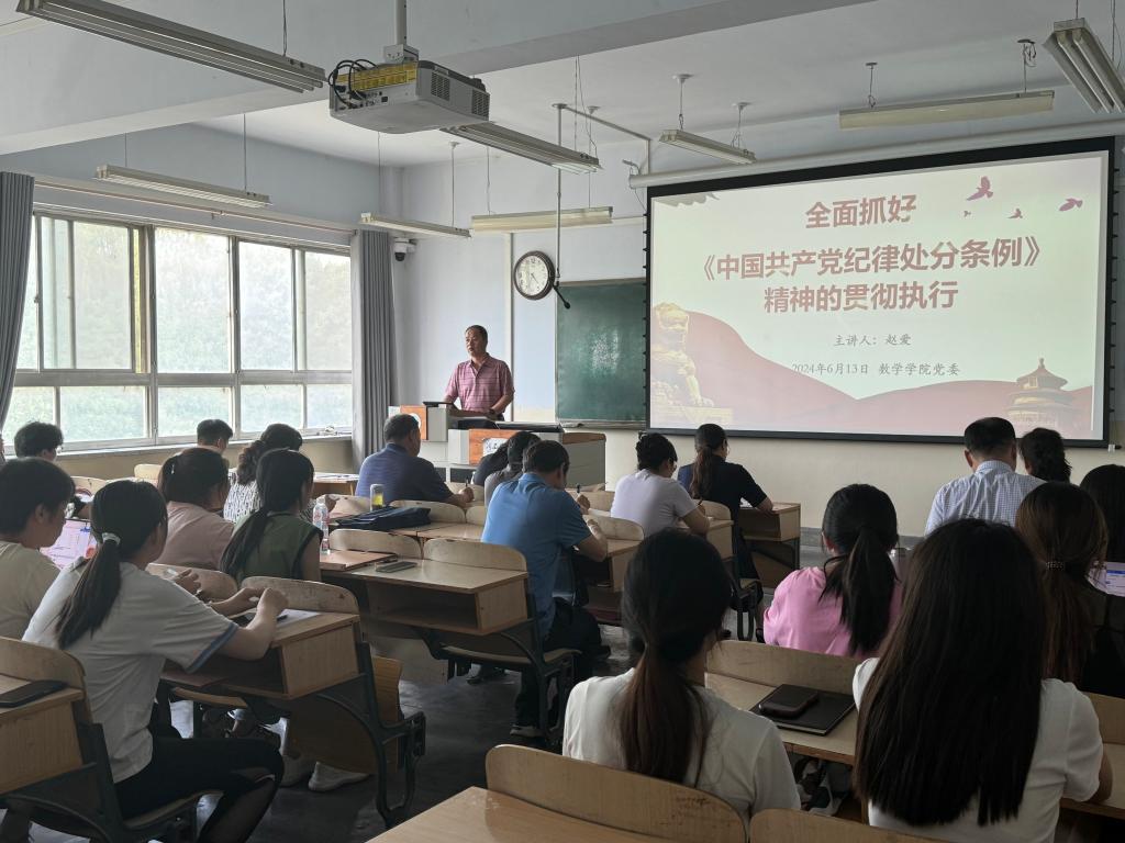 6月13日下午,数学公司党委书记赵爱以《全面抓好<中国共产党纪律处分条例>精神的贯彻执行》为题,为党员讲授党纪学习教育专题党课。公司57名师生党员参加。
