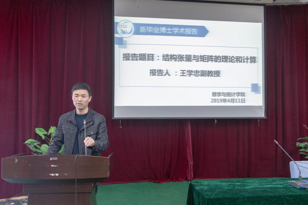 suncitygroup太阳集团于2019年4月11日下4:30在学术二厅举行了suncitygroup太阳集团第十九届“学术活动月”——新毕业博士王学忠副教授学术报告会,公司全体教师和数学与应用数学专业、金融数学专业员工200多人参加了报告会,报告会由公司副经理朱睦正教授主持。
